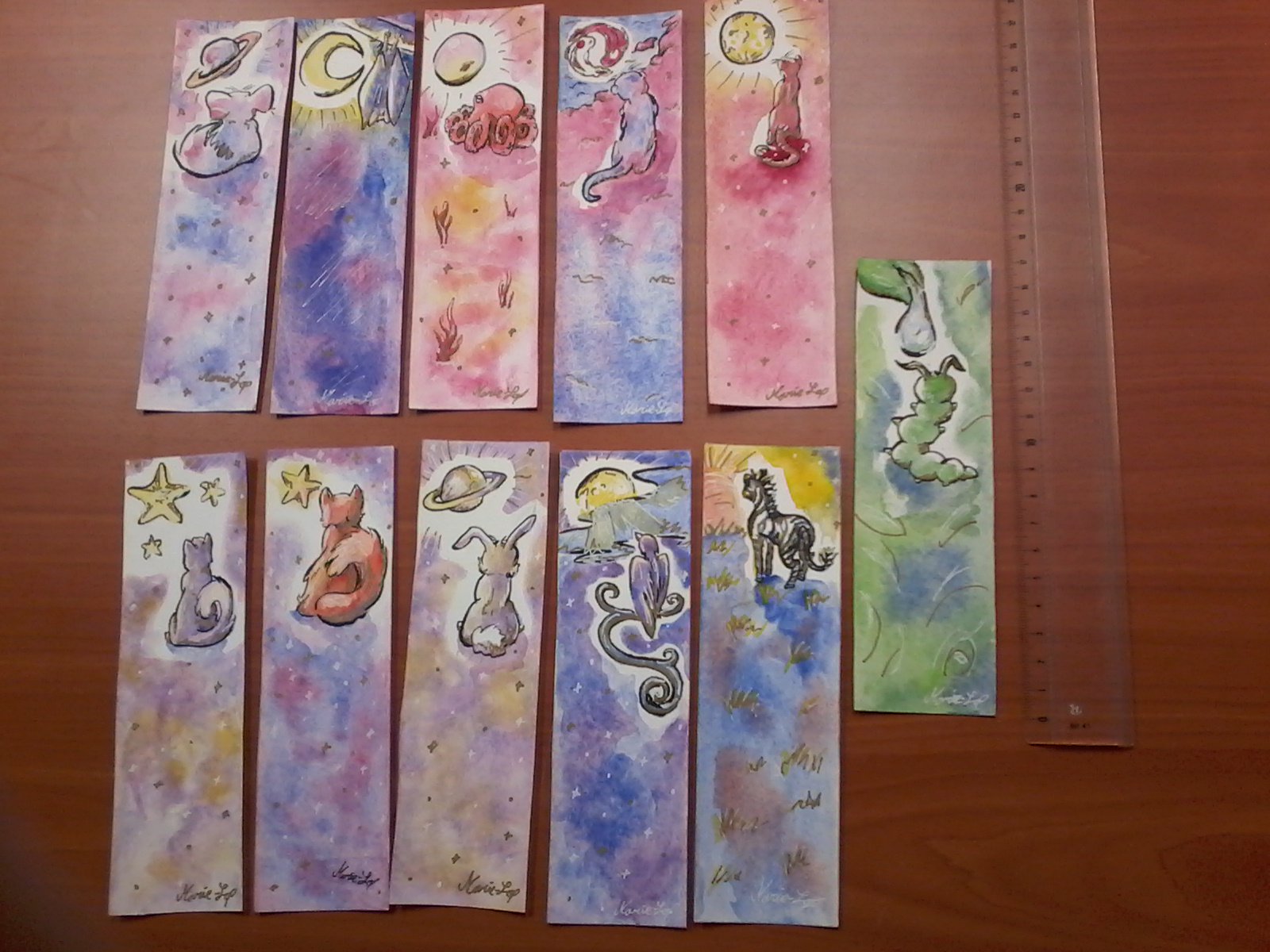 J'ai commencé à faire des petits goodies en vue de pouvoir m'acheter du meilleur matos à dessin. Et c'est quand même bien plus sympa de vendre des marques-page que de quémander de l'argent aux parents... Alors voilà, qu'en dites-vous ? Quels sont vos préférés ?